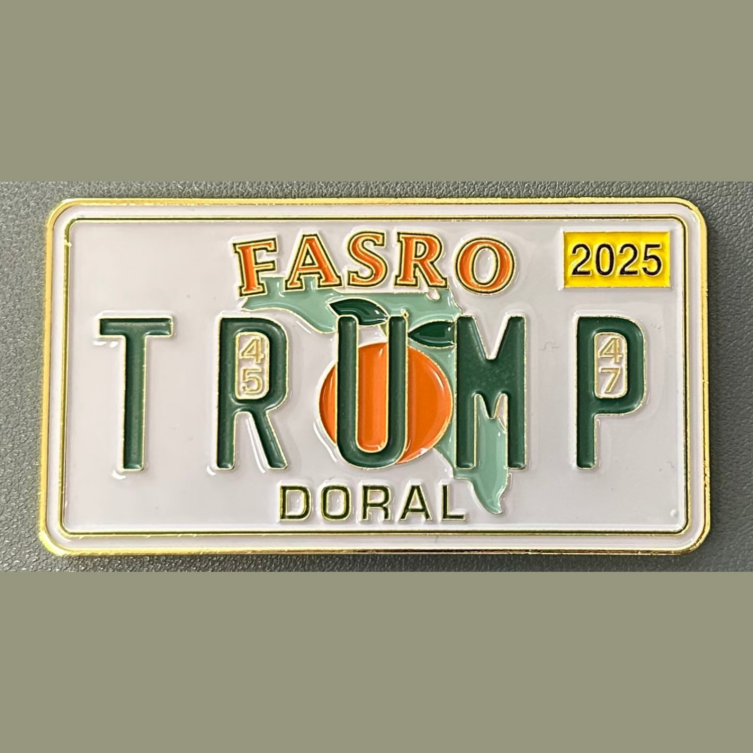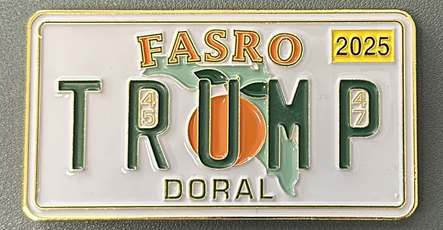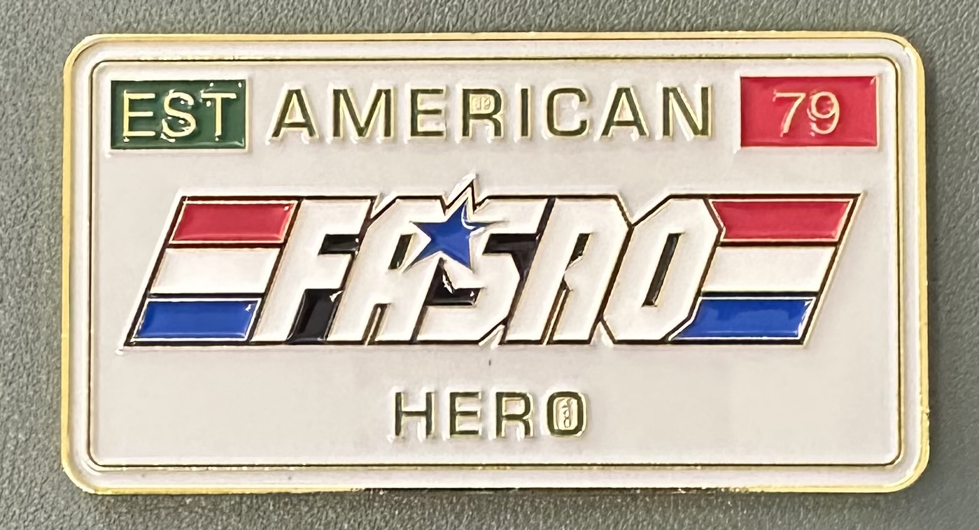 This coin measures 3.5 inches long by 2 inches tall, total of 7 square inches total. The reverse side is a GIJOE themed FASRO logo. This coin is a nod to the President as our 2025 conference was hosted at the Trump National in Doral, Florida. Only 300 of these were produced and each one is serialized on the bottom.